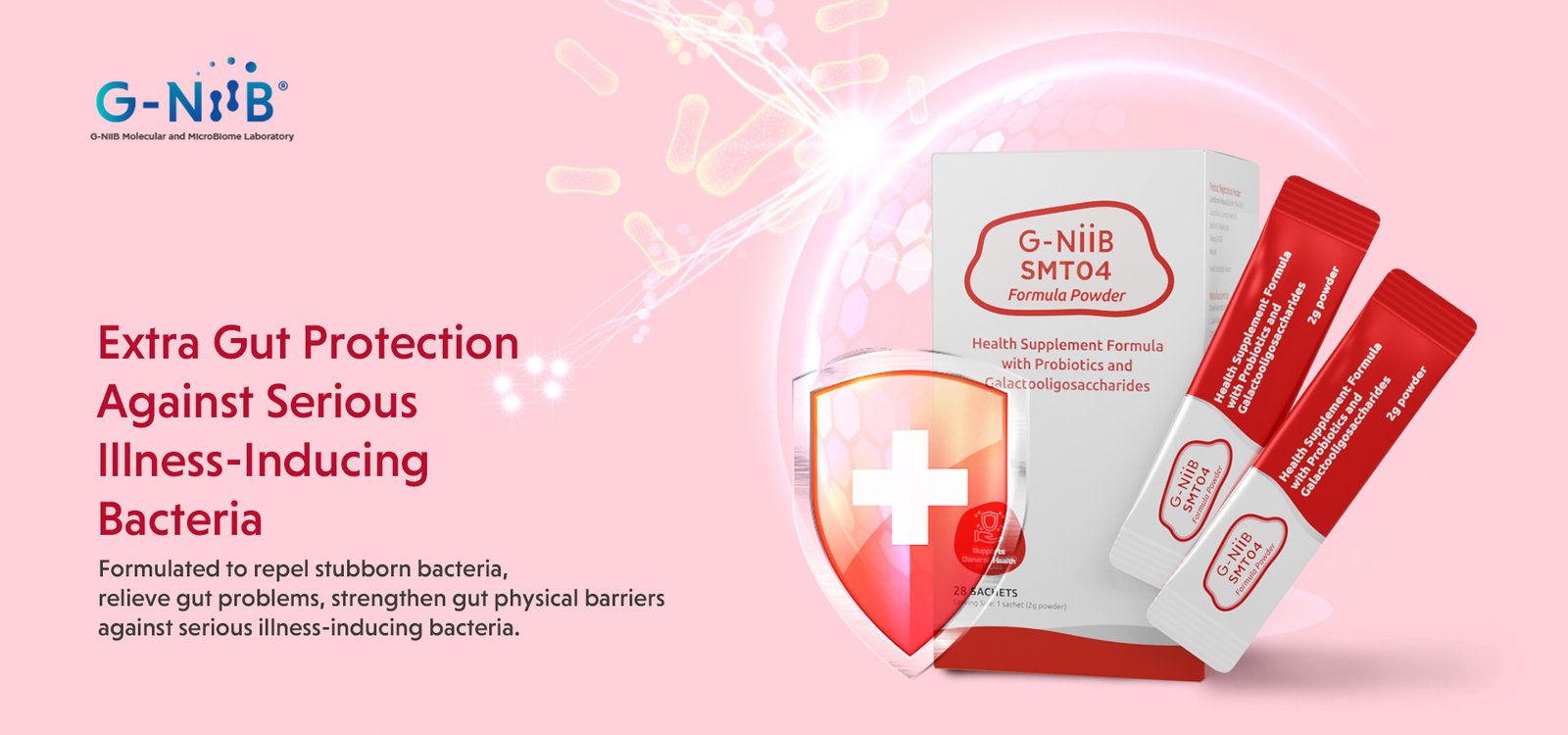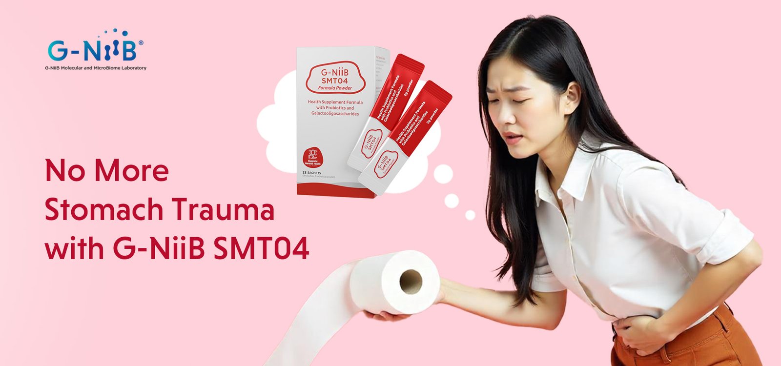 G-NiiB SMT04 targets and combats M3 bacteria, helping to restore the gut's natural defenses and enhance its protective barrier. It's specifically formulated for individuals experiencing gut-related issues such as bloating, gastrointestinal discomfort, diarrhea, and gut sensitivity.
