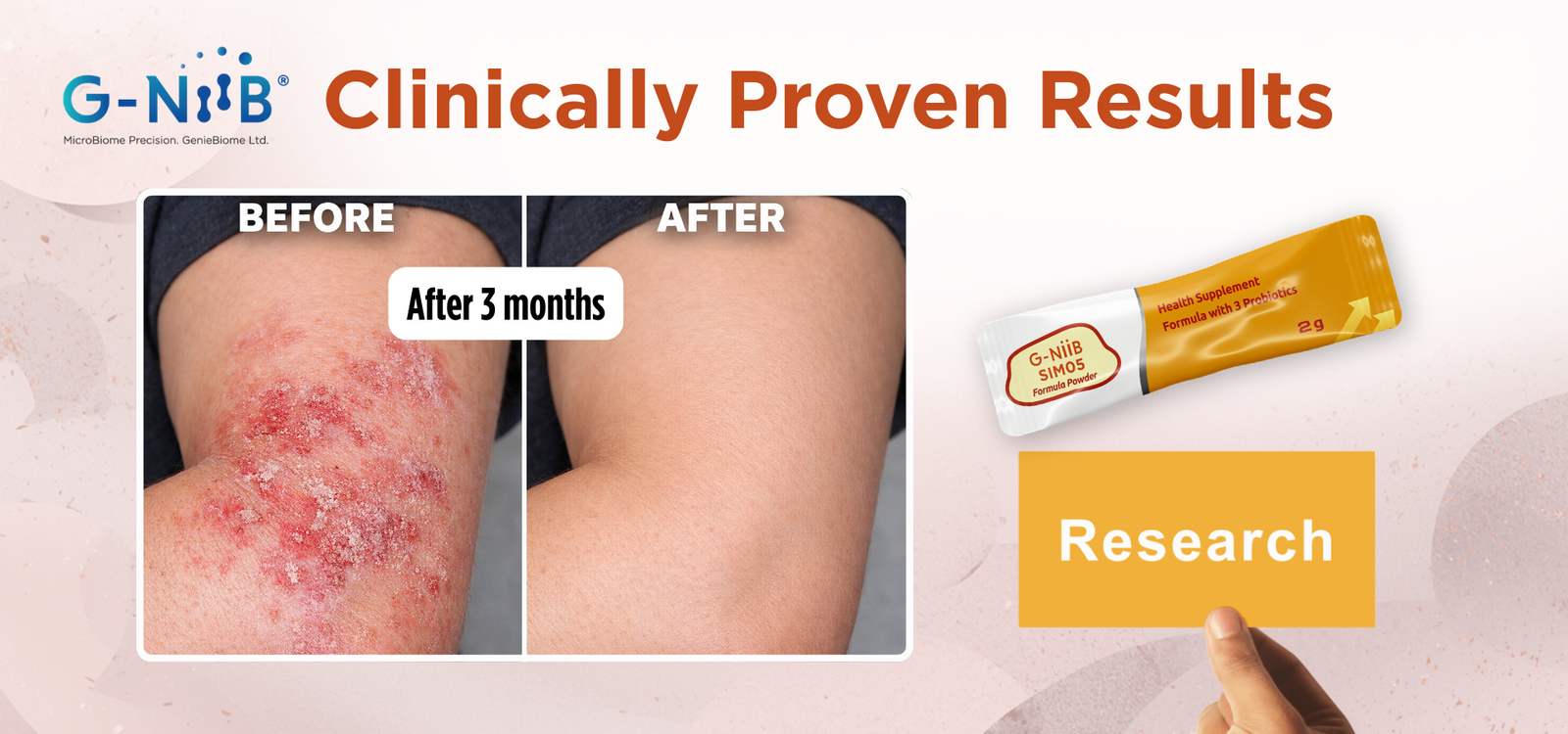 G-NiiB SIM05 is a patented microbiome precision formula containing 2 strains of Bifidobacteria, Lactobacillus, and prebiotics, designed to help rebalance a dysbiotic gut and improve the gut–skin axis. It is clinically proven to normalize the gut microbiome profile and, as a result, help relieve skin inflammation, strengthen the skin barrier, and fight Staphylococcus aureus (Staph. aureus) infection in adults and children above 6 years of age.